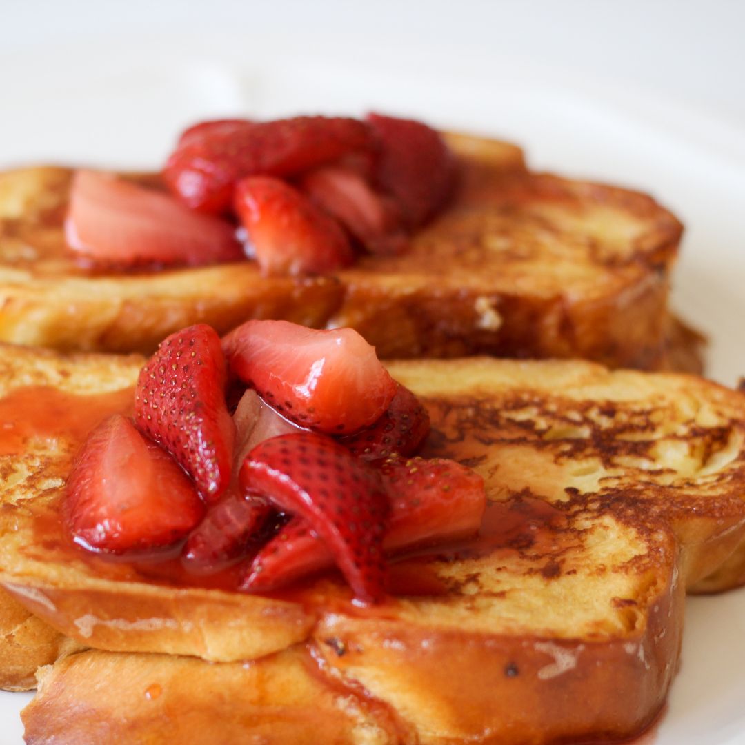Two slices of French toast topped with fresh, juicy strawberries on a plate. The toast is golden and drenched in syrup.
