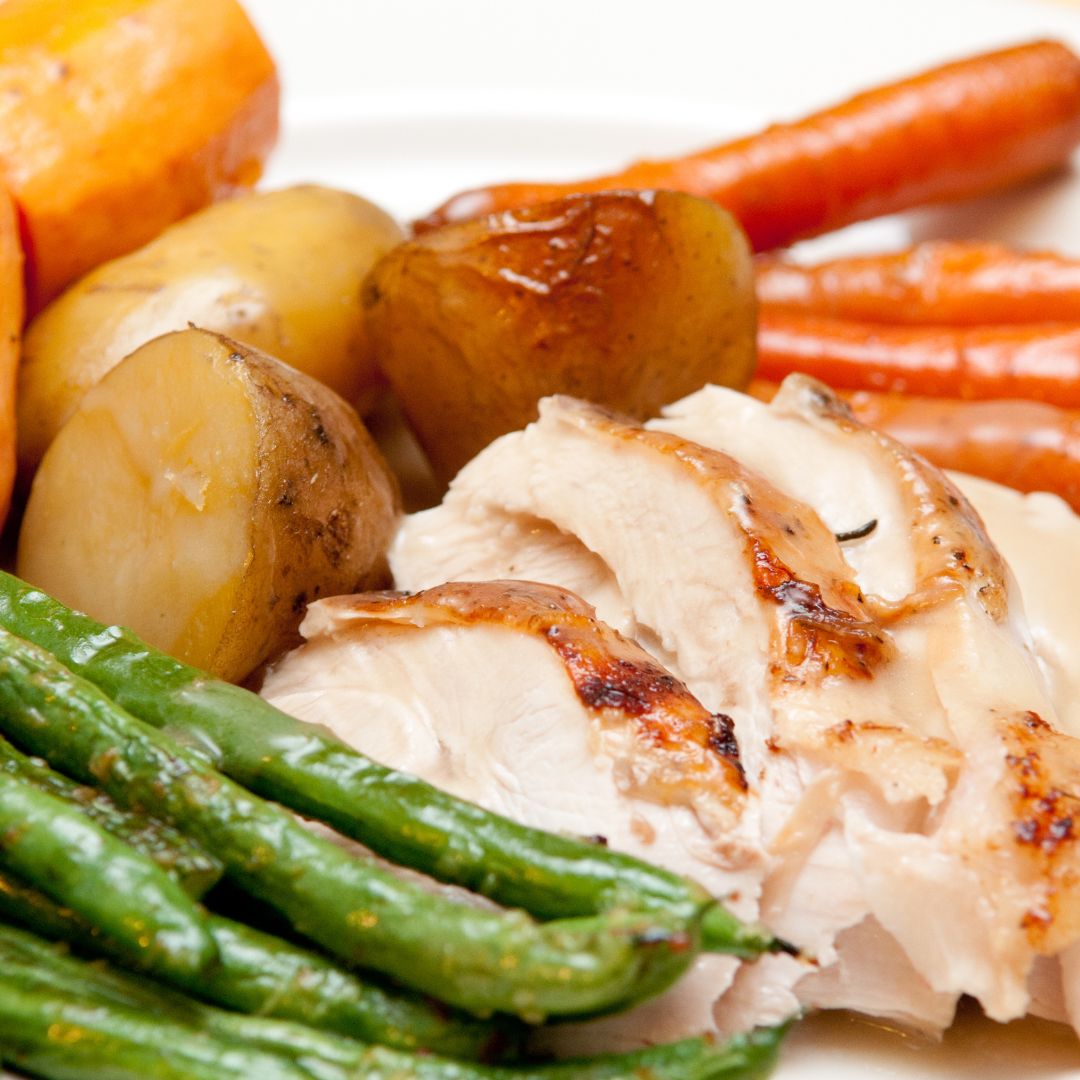 Close-up of a roasted meal featuring sliced chicken, roasted potatoes, carrots, and green beans, emphasizing texture and colors.