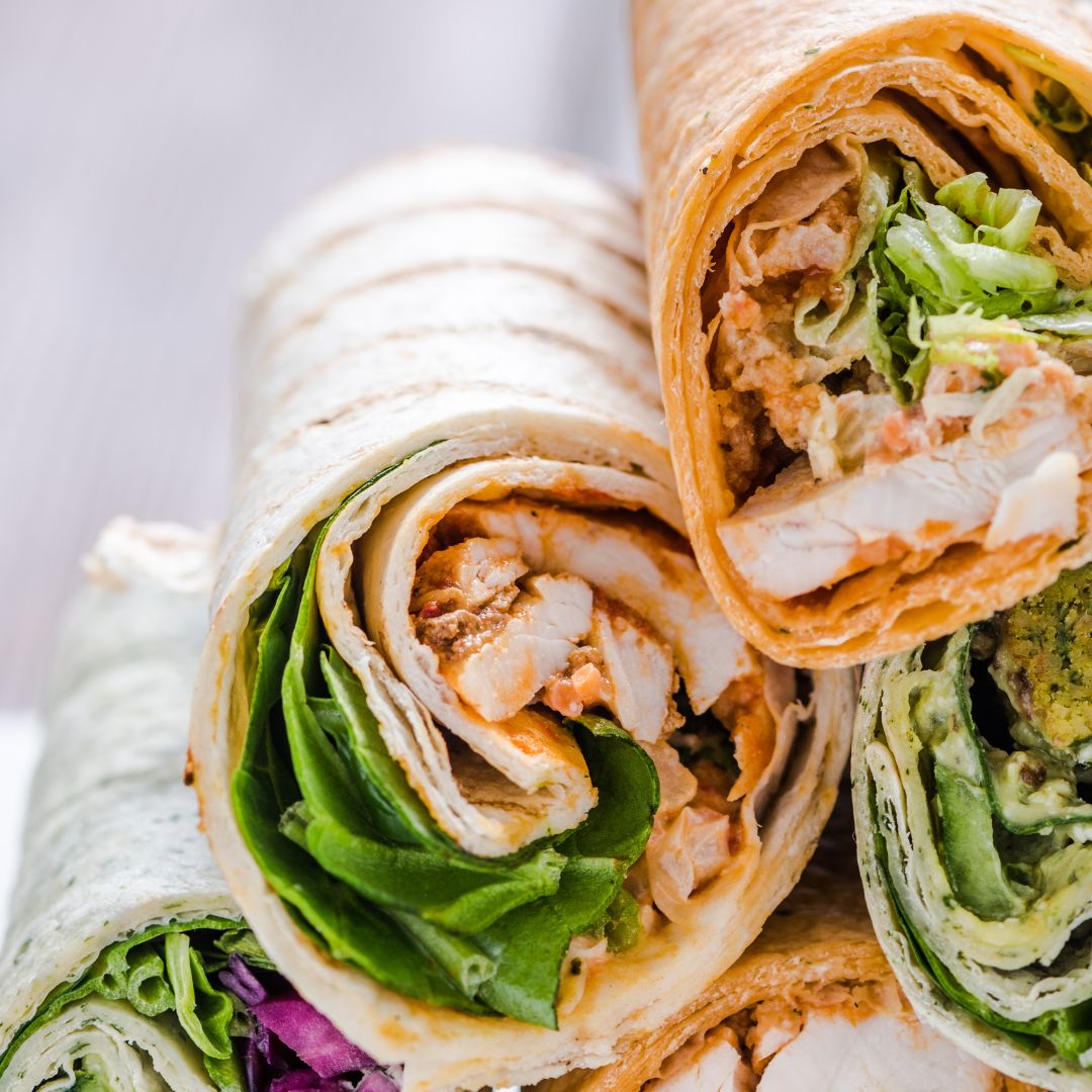 A close-up of three wraps, filled with grilled chicken, fresh lettuce, and various sauces, showcasing a delicious, vibrant selection of flavors.